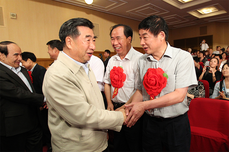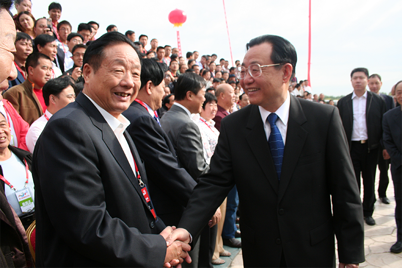 2008年9月27日,出席第八届全国“村长”论坛的中共中央政治局委员、全国政协副主席王刚与吴栋材亲切握手。