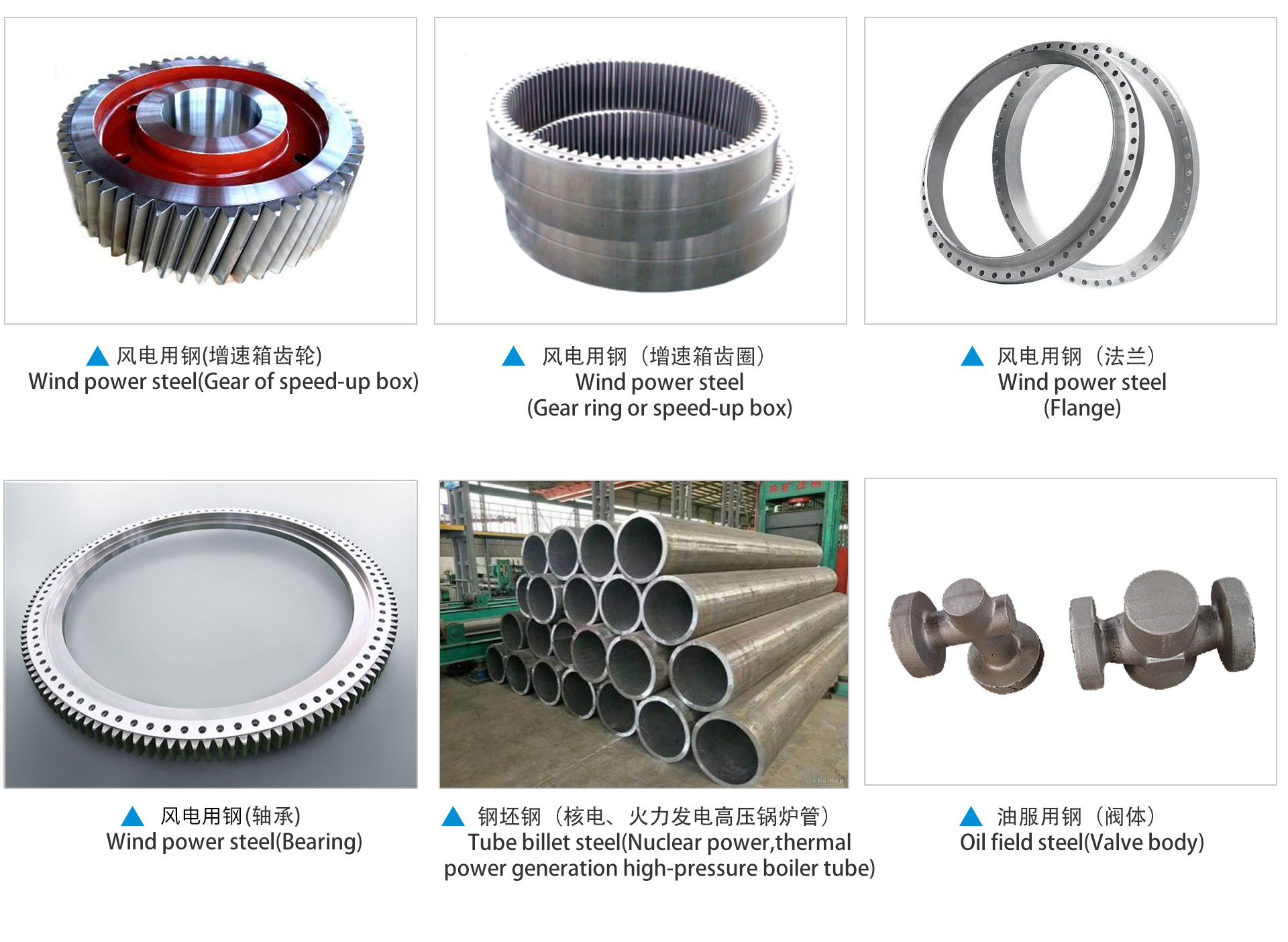 风力发电机、油服设备等大型机械的回转支承、阀体、套管以及大型机械的轴等。 Used for making slewing bearings, valve bodies, casing pipes and shafts of large machinery such as wind driven generators, oilfield service equipment, etc. |